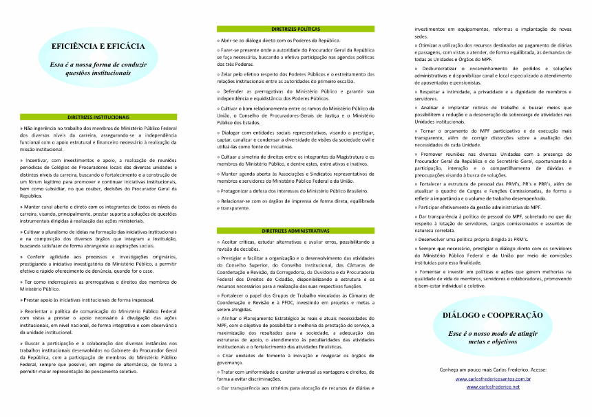 Dessa forma, a nova gestão que foi proposta na campanha de Carlos Frederico teve fundamento não só na agilidade da atividade institucional, com a implantação de novas dinâmicas quanto as ações constitucionais da atribuição do Procurador Geral da República e na elaboração de pareceres, investigações, denúncias etc., mas também na adoção de medidas que ordenassem, por prioridades, as diversas outras atividades afetas ao Procurador Geral da República, de